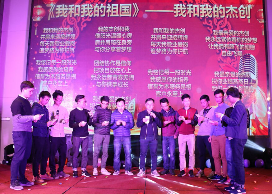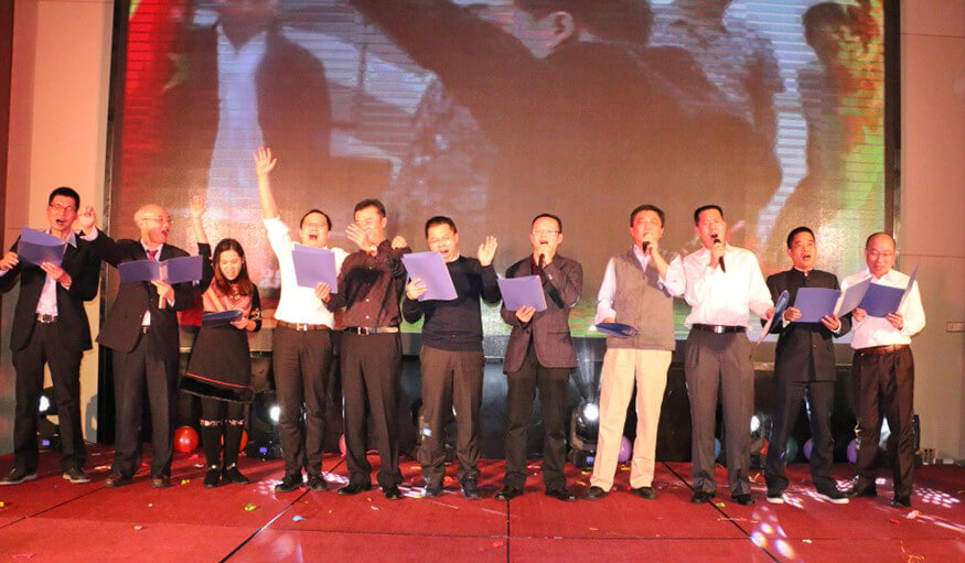 在度过三个小时的欢乐时光后,年会进入了尾声。全场人员齐齐进入演唱状态,伴随着优美的旋律,接连合唱了《相亲相爱一家人》、《同一首歌》、《朋友》三首歌曲。歌声飞扬,群情高涨,将现场气氛推向最高潮。大家放开歌喉,大声唱出心底的心声,尽情表达出对710公海寰宇、对他人的祝福和感恩。所有人的歌声交织在一起,彼此的心灵也在密切地交流。在响亮动听的大合唱中,710公海寰宇智能2016年度总结表彰大会暨2017迎新年会圆满落下了帷幕。