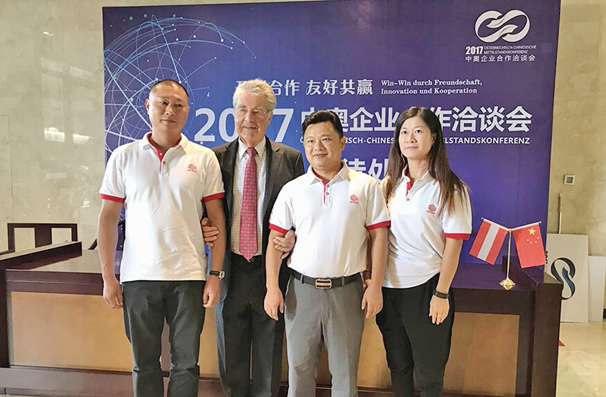 奥地利前总统海因茨·菲舍尔与710公海寰宇智能副总裁戴宝、揭阳分公司总经理林浩生、公司总裁助理郑庆丽合影