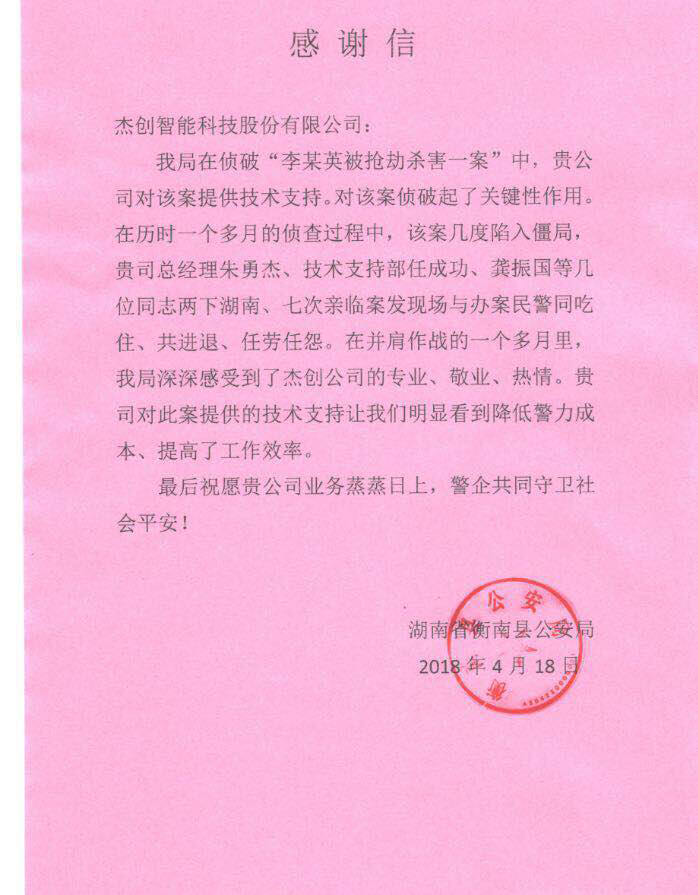 近日,湖南省衡南公安局发来感谢函,对710公海寰宇智能在近期协助侦破“李某英被抢劫杀害一案”表示感谢,目前相关犯罪嫌疑人已被依法刑事拘留,案件正在进一步侦办中。